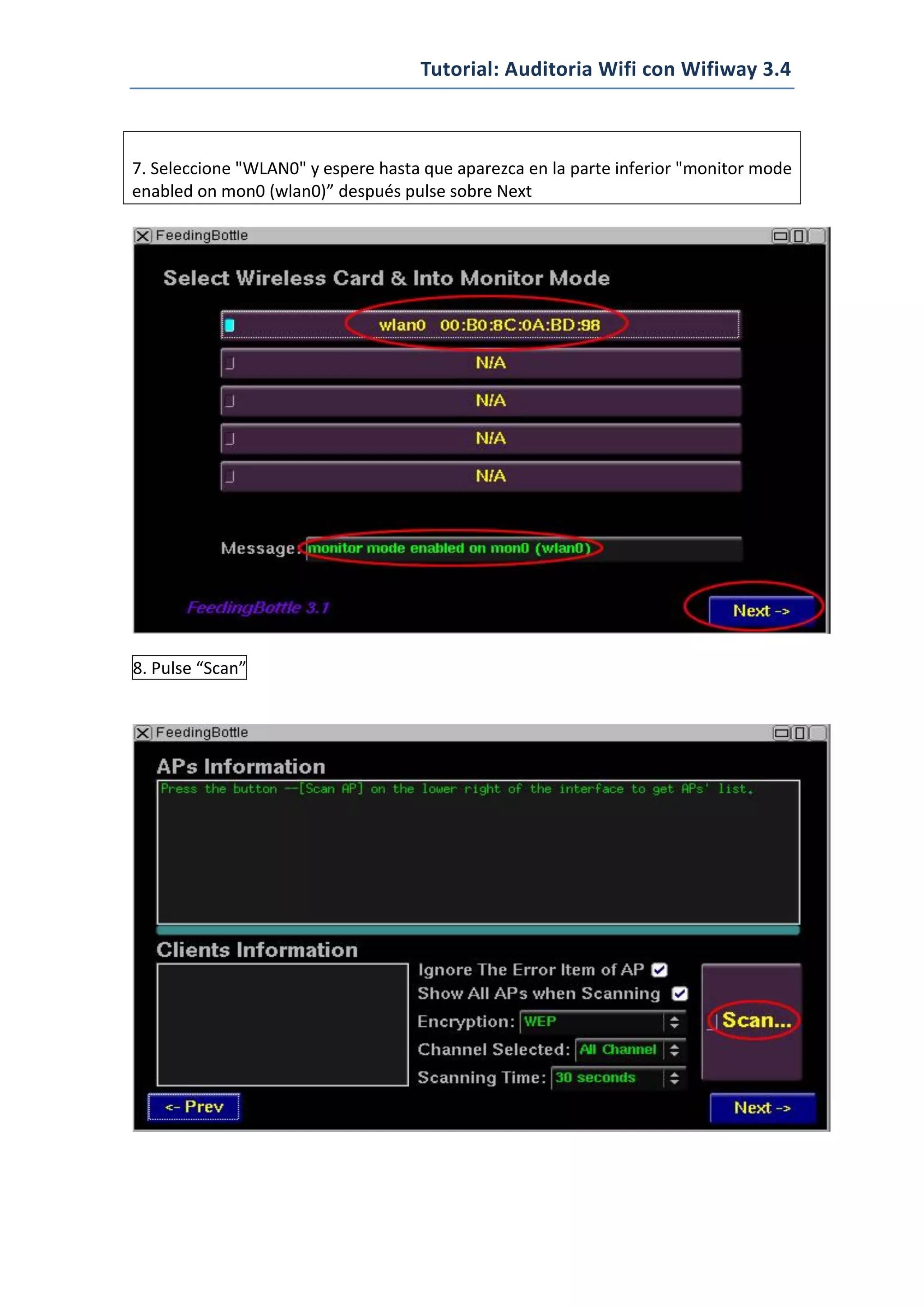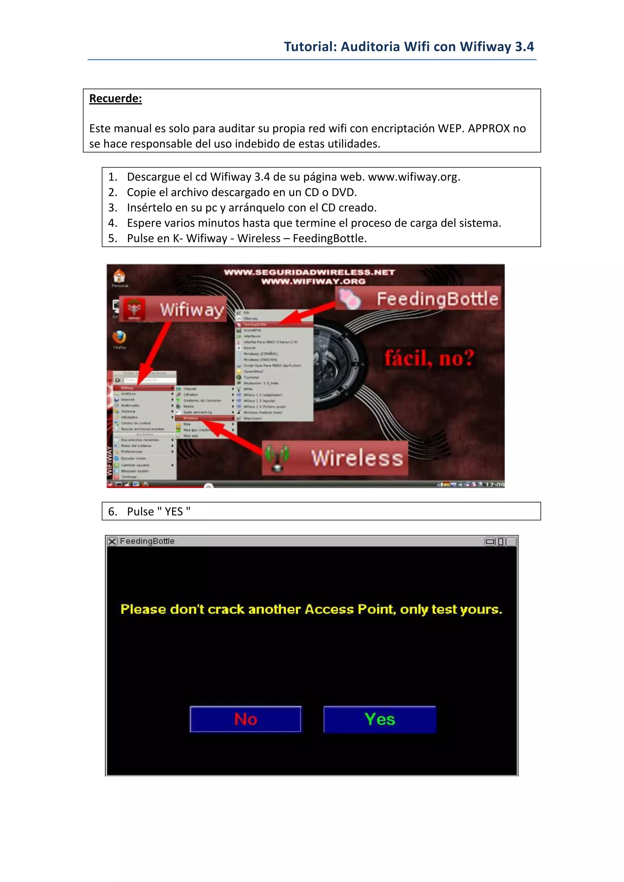 Este documento proporciona un tutorial en 11 pasos para auditar una red WiFi con encriptación WEP usando el software Wifiway 3.4. El tutorial explica cómo descargar e instalar el software, activar el modo monitor de la interfaz de red inalámbrica, escanear las redes disponibles, seleccionar un punto de acceso y cliente, y lanzar un ataque de fragmentación o ARP para descifrar la clave WEP en unos segundos.