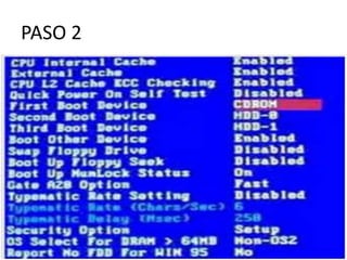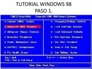 Este documento proporciona 20 pasos para instalar el sistema operativo Windows 98. Incluye pasos como comprobar el disco duro, elegir la ubicación de instalación, seleccionar el tipo de instalación, introducir información de usuario, aceptar el contrato de licencia y proporcionar la clave de instalación. Finalmente, solicita reiniciar el equipo para completar la instalación de Windows 98.