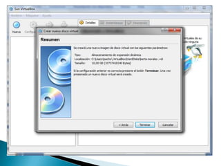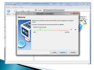 VirtualBox es un software de virtualización desarrollado por Oracle que permite instalar sistemas operativos invitados en un sistema operativo anfitrión. El documento proporciona una guía paso a paso para crear una máquina virtual y realizar la instalación de Windows XP, abarcando desde la creación del disco duro virtual hasta la configuración final del sistema operativo. Se detallan los pasos necesarios para formatear, reiniciar y completar la instalación de Windows XP en un entorno virtual.