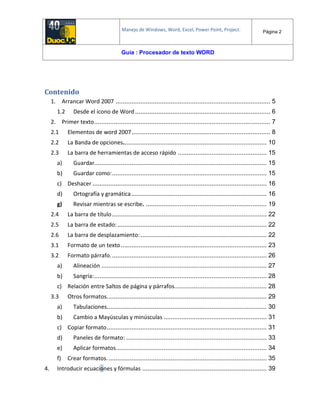 Este documento proporciona una guía sobre el uso básico de Microsoft Word 2007. Explica cómo iniciar Word, escribir un primer texto, y describe los elementos clave de la interfaz como la cinta de opciones, la barra de herramientas de acceso rápido y las diferentes pestañas. También cubre temas como formato de texto, tablas, imágenes, y herramientas de edición y revisión.