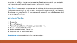 Este documento explica qué son las nubes de palabras y cómo se pueden crear usando la herramienta gratuita Wordle.net. Describe las ventajas de Wordle, como que es sencilla de usar y no requiere registro, y explica los pasos para ingresar a la página web, pegar o enlazar un texto, personalizar la nube de palabras creada, y guardarla o insertarla en otro documento.