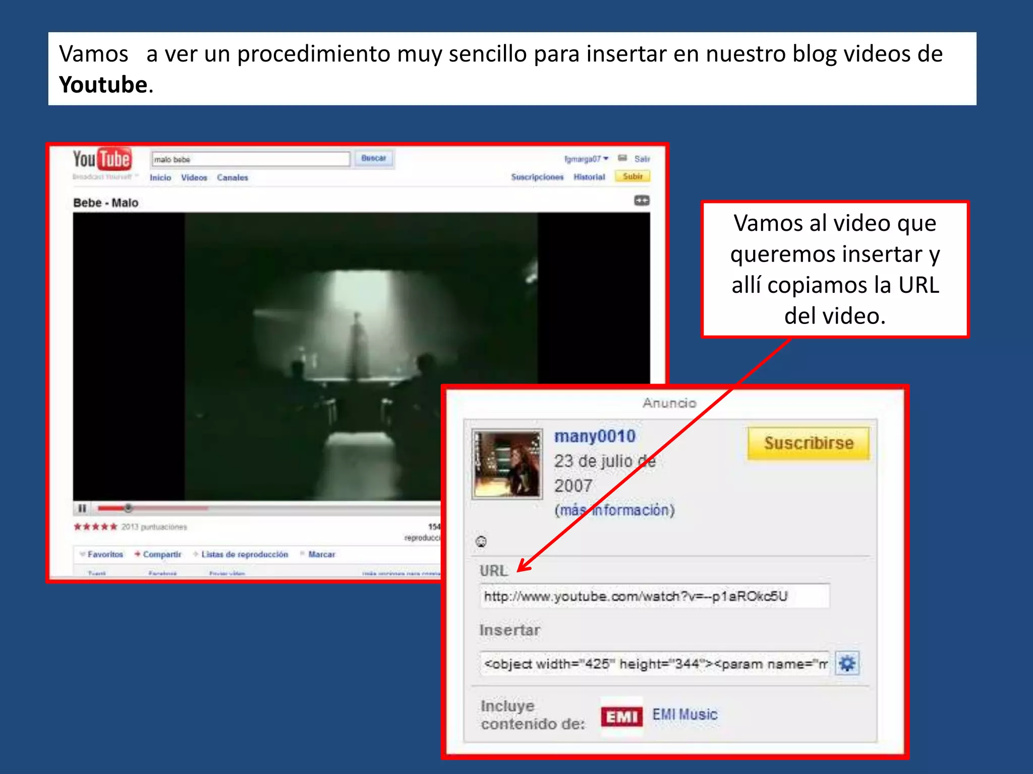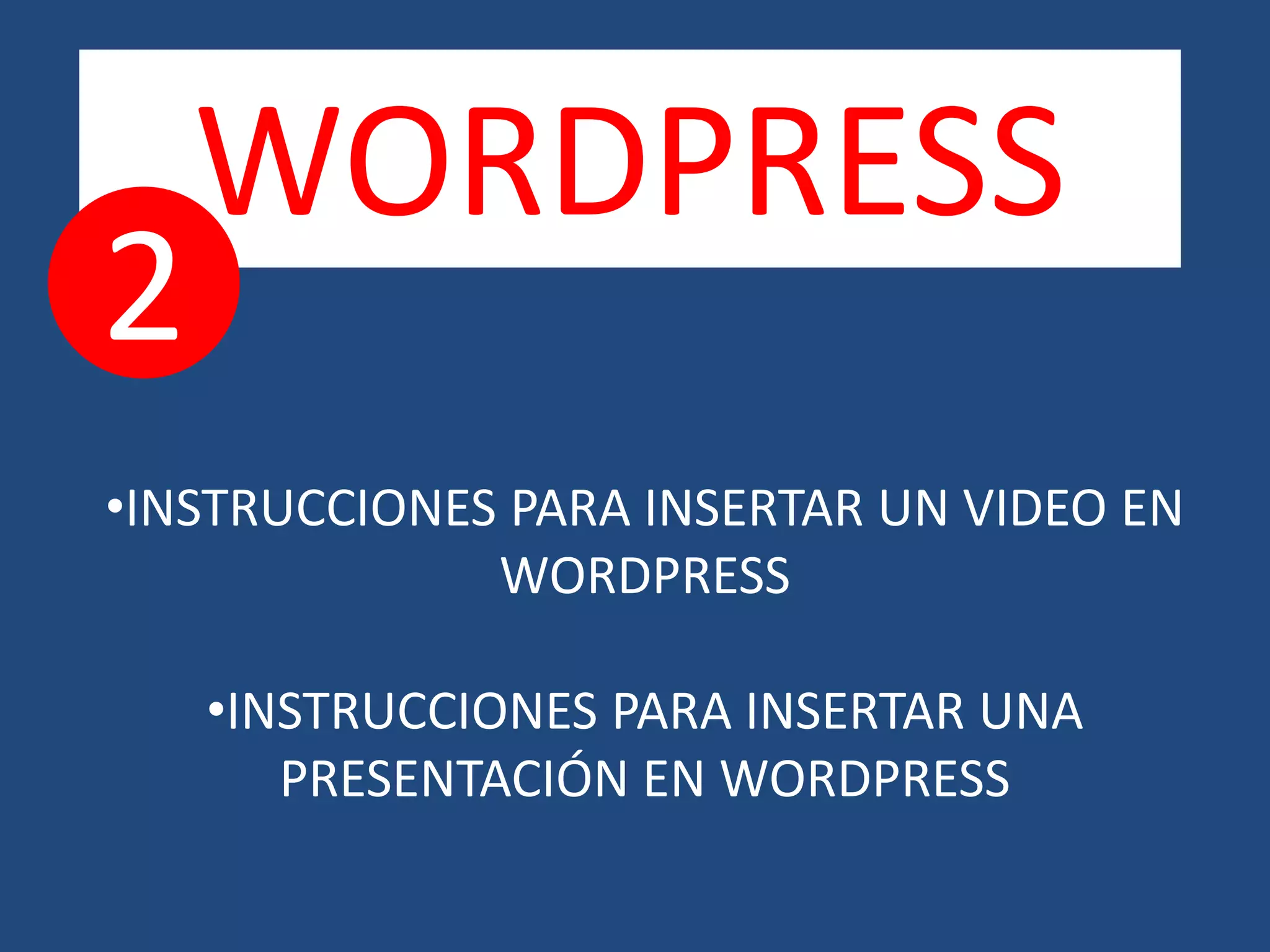 Este documento proporciona instrucciones para insertar videos de YouTube y presentaciones de Slideshare en WordPress. Explica que para videos se copia la URL del video de YouTube y se pega en la ventana de inserción de video en el editor de WordPress. Para presentaciones, se copia el código proporcionado en la opción Custom de Slideshare y se pega en el editor de WordPress.