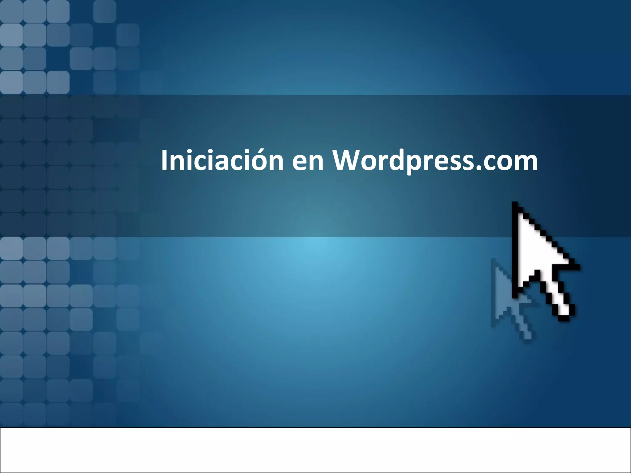 Trata sobre cómo crear y administrar un blog en WordPress.com. Explica que primero se debe crear una cuenta con nombre de usuario y contraseña. Luego, se procede a crear el blog eligiendo el dominio, título y otros detalles. Después, el panel de control permite escribir nuevas entradas, subir imágenes, y gestionar comentarios y diseño. El objetivo es proveer una guía práctica para iniciar un blog en WordPress de manera sencilla.