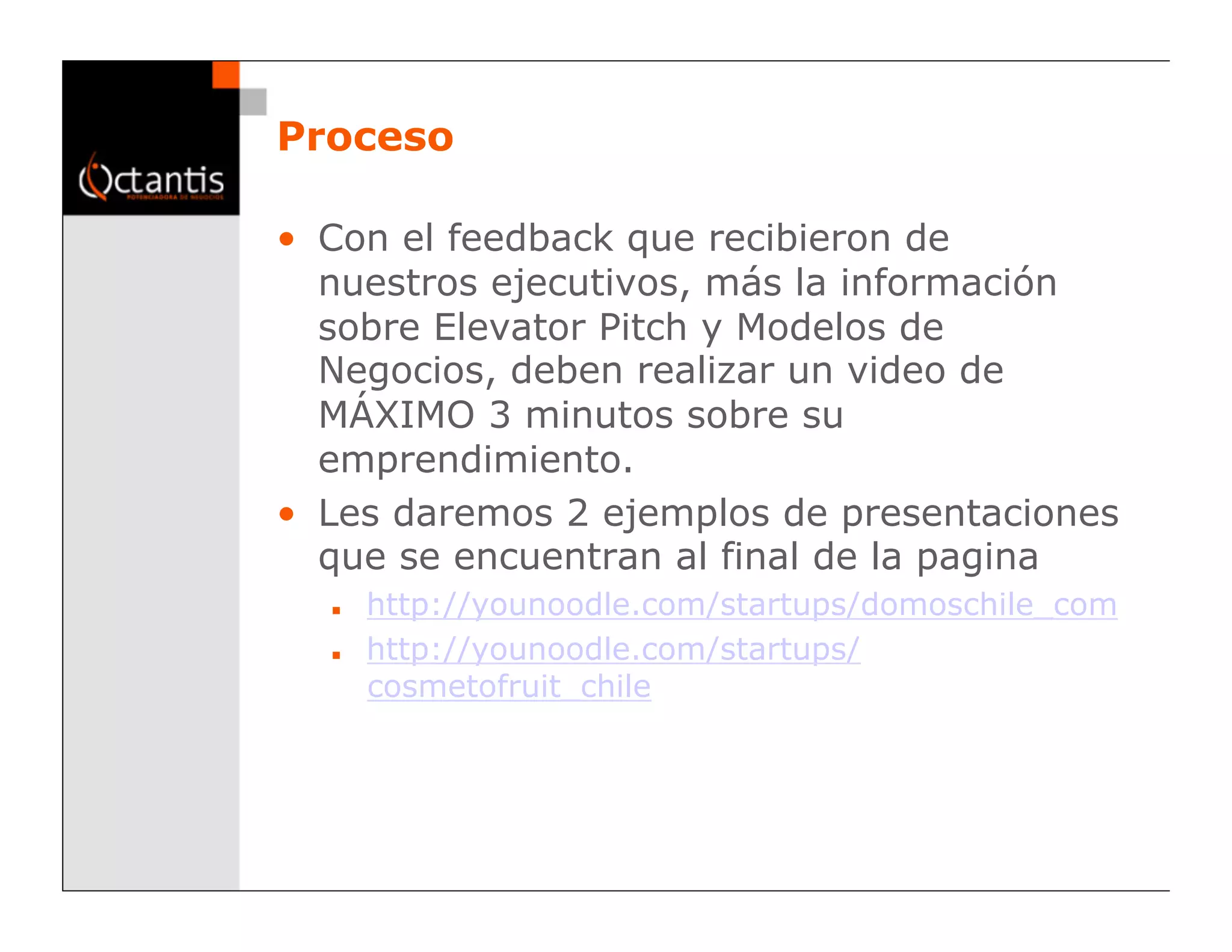 Este documento proporciona instrucciones para crear y subir un video de elevator pitch de máximo 3 minutos sobre su emprendimiento a YouTube. Explica el proceso de grabación y publicación del video en YouTube, incluyendo cómo suscribirse a una cuenta de YouTube, grabar el video usando la cámara web, y enviar la URL del video publicado.