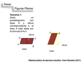 Este documento presenta varios teoremas y ejemplos para calcular el área de figuras planas como paralelogramos, triángulos, trapecios y polígonos regulares. Explica las fórmulas para el área de cada figura en términos de su base y altura. Luego, proporciona varios ejercicios prácticos resueltos para calcular el área de diferentes figuras aplicando las fórmulas correspondientes.