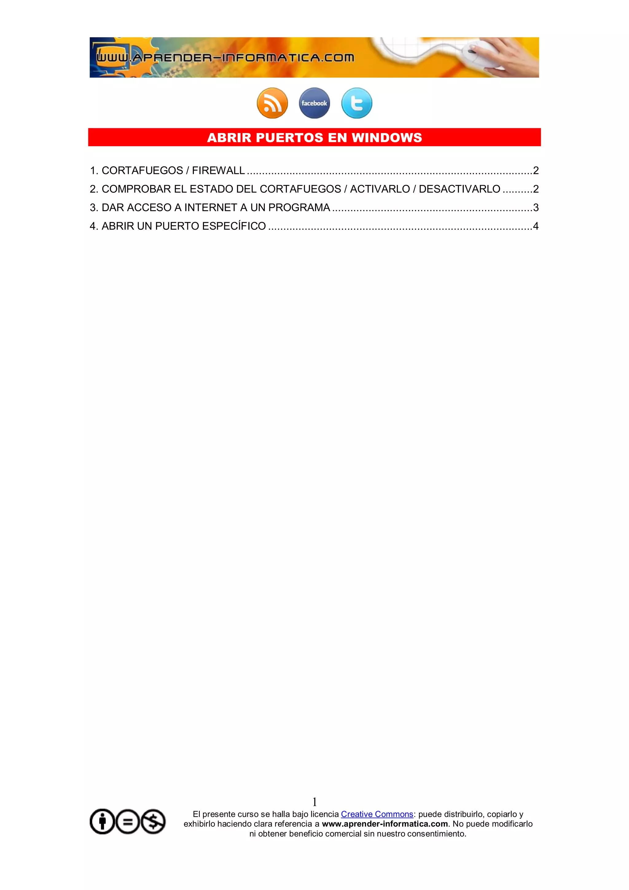 Este documento explica cómo abrir puertos en Windows. Brevemente describe el funcionamiento de los cortafuegos y cómo comprobar y cambiar su estado. Luego detalla los pasos para dar acceso a Internet a programas específicos o abrir puertos de comunicación en particular.