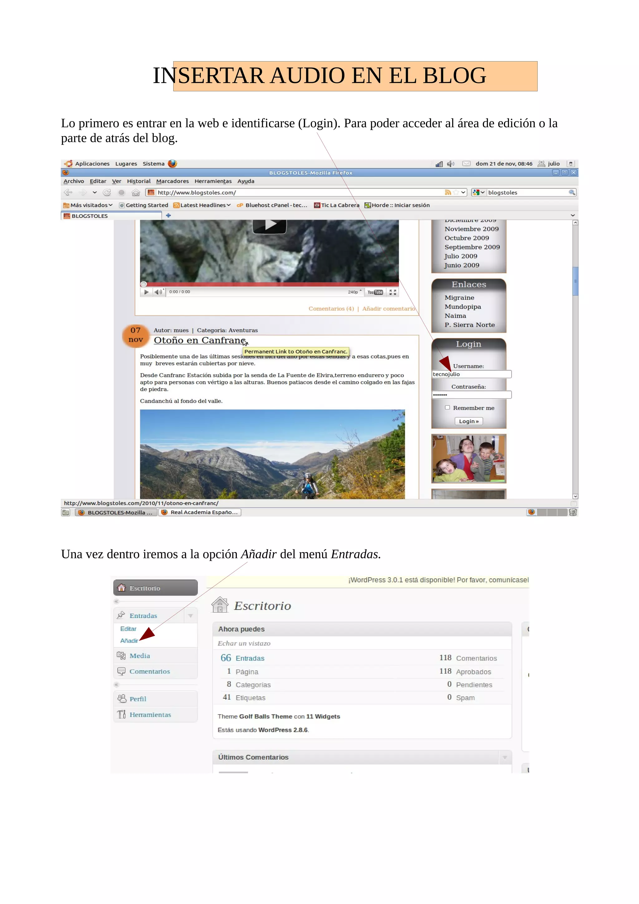 Para insertar audio en un blog, el usuario debe identificarse en la web del blog, seleccionar la opción "Añadir" en el menú "Entradas" para escribir un nuevo artículo, subir un archivo de audio de hasta 10MB a través de la ventana emergente, y luego publicar la entrada asignándole una categoría para que el reproductor de audio aparezca en el blog.
