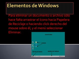 Este documento proporciona instrucciones sobre cómo eliminar archivos arrastrándolos a la Papelera de Reciclaje o haciendo clic derecho y seleccionando "Eliminar", y describe varios componentes comunes de los sistemas operativos como iconos, el botón de inicio, el buscador, la Papelera de Reciclaje, el panel de aplicaciones, la barra de tareas, ventanas y el Explorador de Windows. También incluye pasos para formatear e instalar Windows de nuevo y sugiere crear carpetas para mantener la