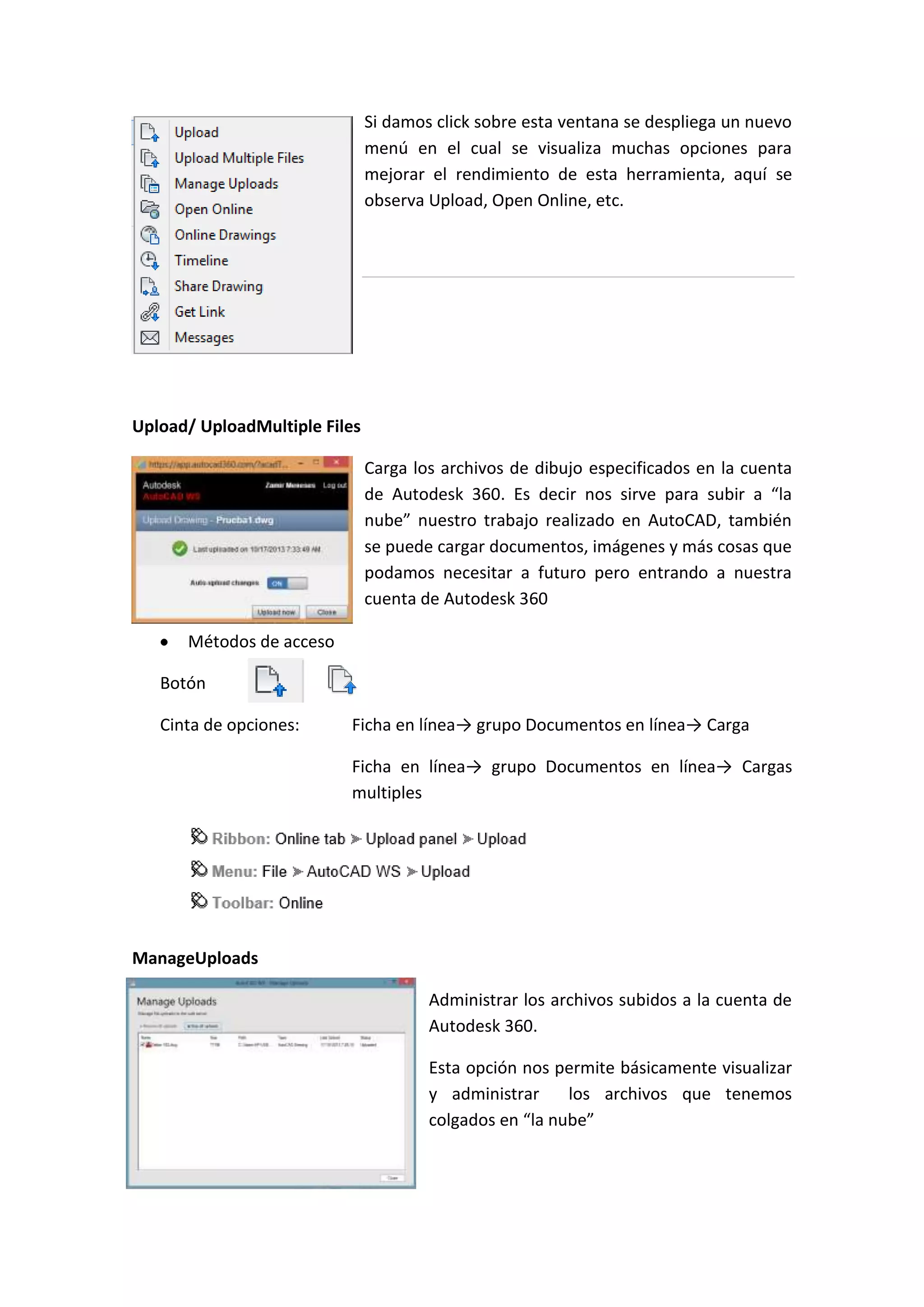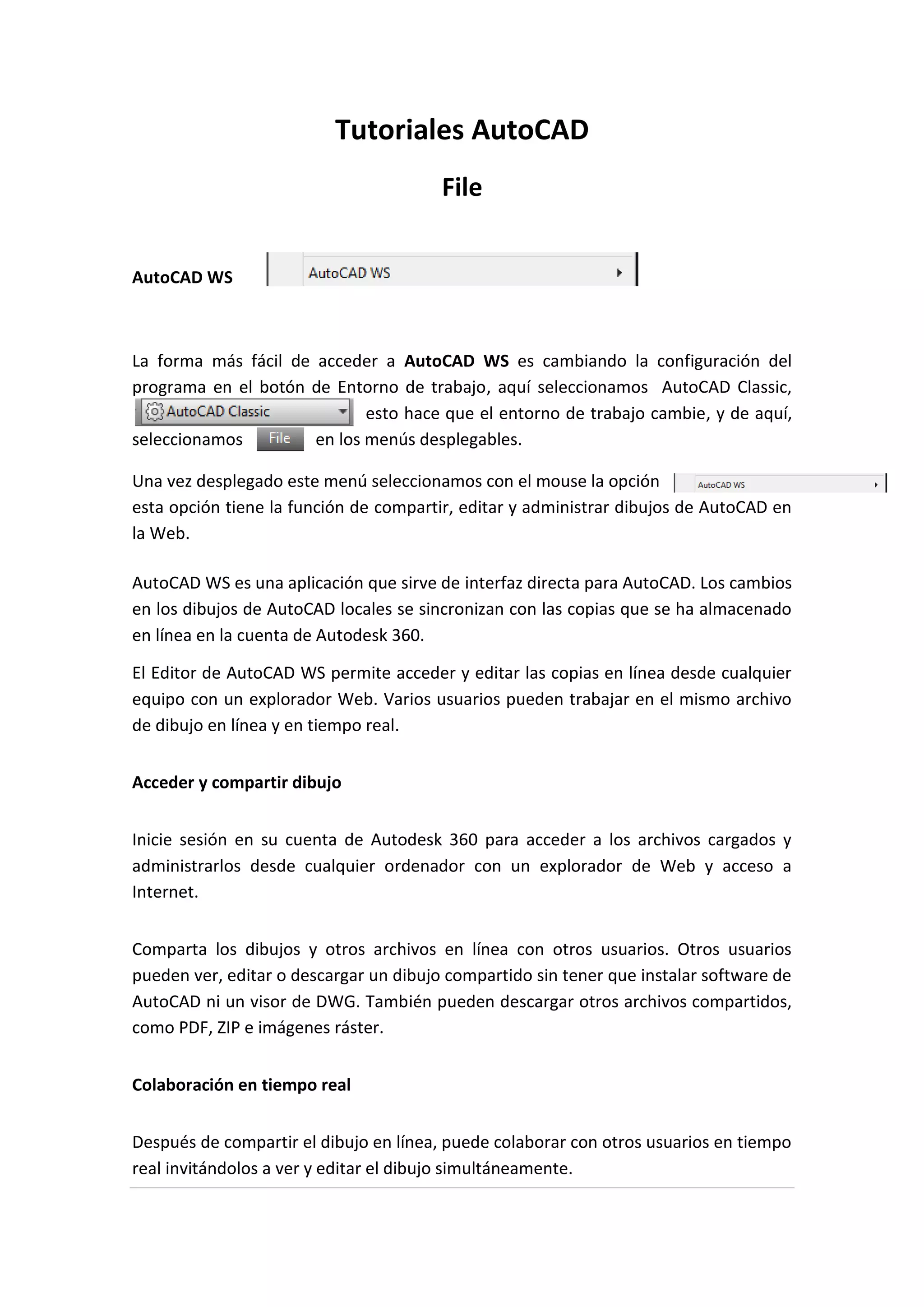 El documento describe las funciones de AutoCAD WS, una aplicación que permite compartir, editar y administrar dibujos de AutoCAD en línea. AutoCAD WS sincroniza los cambios en los dibujos locales con copias almacenadas en línea, y permite a varios usuarios editar archivos en tiempo real desde cualquier equipo con un navegador web. El documento explica cómo acceder y compartir dibujos, colaborar en tiempo real con otros, y las diversas opciones disponibles en el menú de AutoCAD WS como cargar, abrir, administrar y compart
