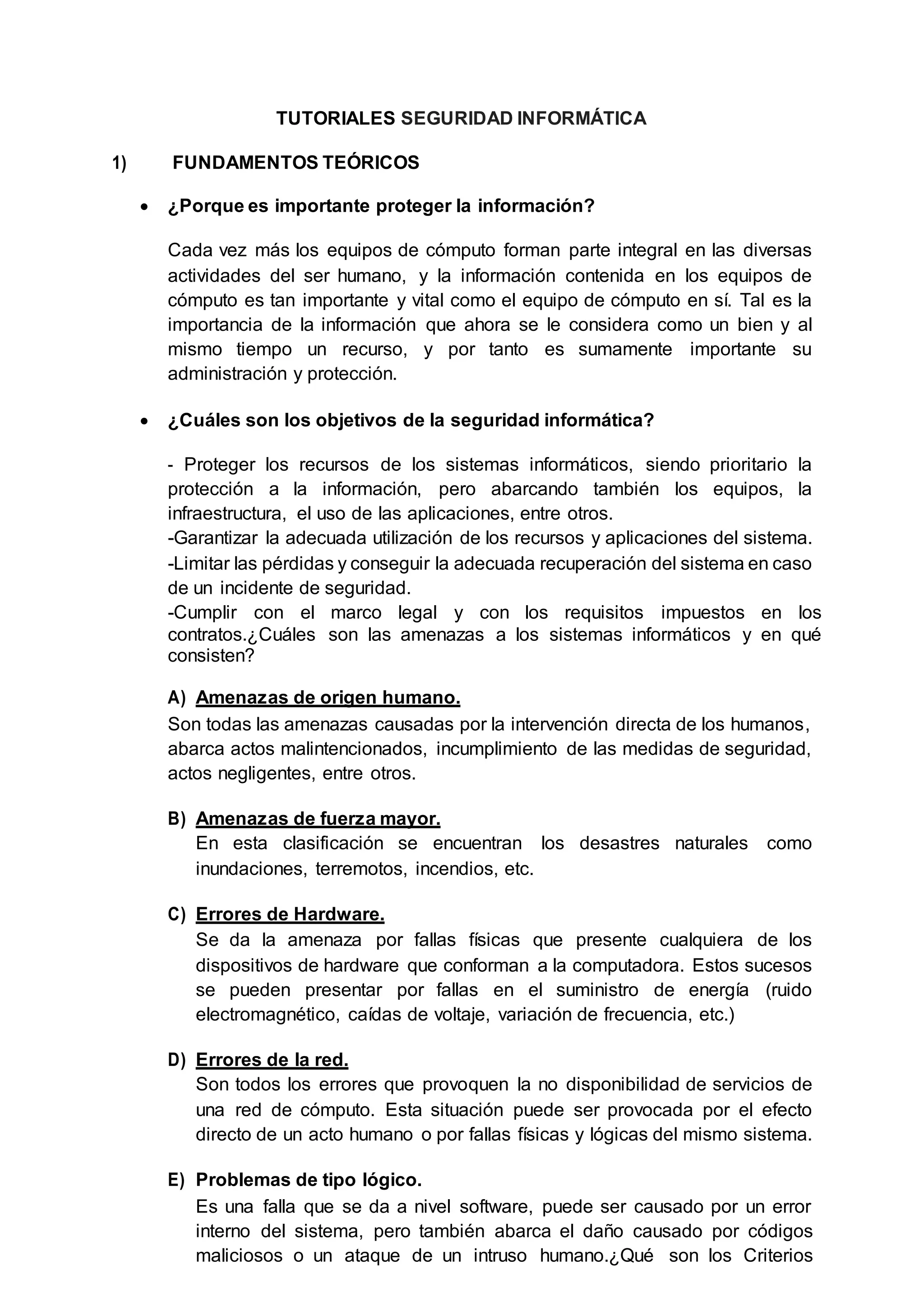Este documento presenta una introducción a los fundamentos de la seguridad informática. Explica por qué es importante proteger la información y cuáles son los objetivos de la seguridad informática. También describe las principales amenazas a los sistemas informáticos, incluyendo amenazas humanas, de hardware, de software y de la red. Finalmente, define conceptos clave como vulnerabilidades, servicios de seguridad y criterios comunes para la evaluación de la seguridad de los productos de tecnología de la información.