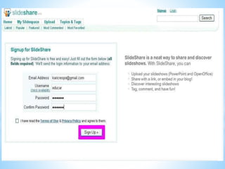 Este documento proporciona una guía sobre cómo usar la herramienta digital SlideShare para gestionar presentaciones. Explica que SlideShare permite subir y compartir presentaciones en línea de forma similar a YouTube. Luego describe los pasos para crear una cuenta, subir una presentación etiquetándola, publicarla y distribuirla en un sitio web o blog. Finalmente, menciona algunas referencias bibliográficas sobre herramientas digitales para la gestión del conocimiento.