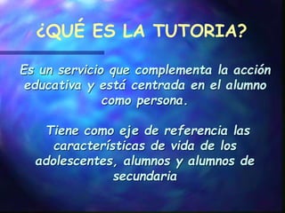 Este documento describe la tutoría en la educación secundaria. La tutoría tiene como objetivo atender las necesidades de desarrollo de los estudiantes, especialmente en áreas afectivas. Se lleva a cabo a nivel grupal en sesiones semanales y de forma personal para cada estudiante. La tutoría utiliza técnicas participativas para motivar la reflexión y promover el cambio positivo en los estudiantes.