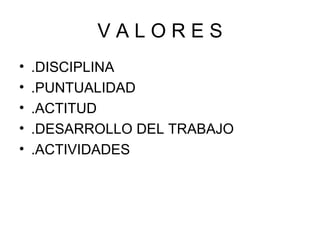 El documento describe un programa de actividades que incluye tutorías y analiza temas como valores, disciplina, puntualidad, actitud y el desarrollo del trabajo a través de diferentes actividades.