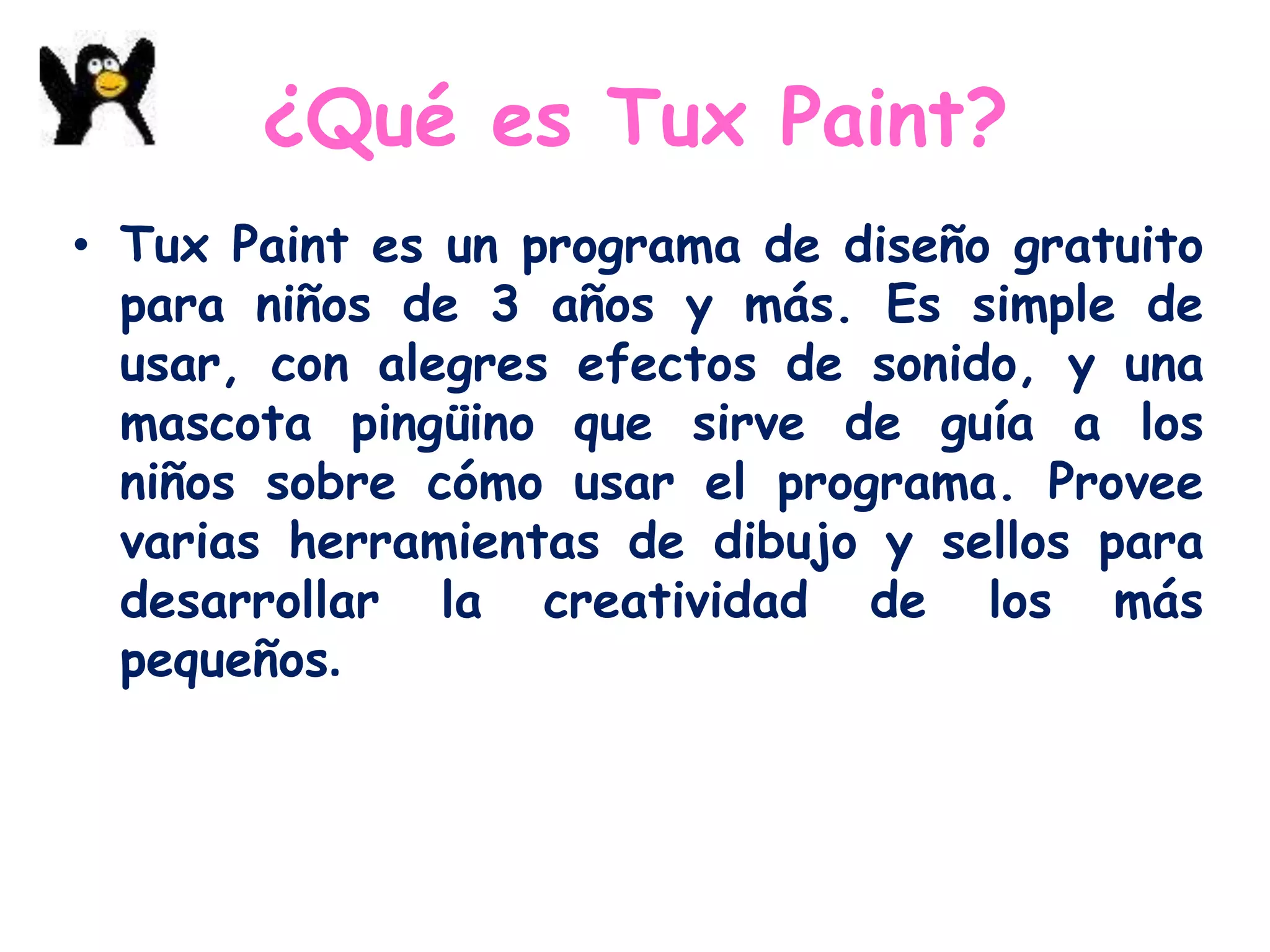 Tux Paint es un programa gratuito de dibujo para niños de 3 años en adelante. Ofrece varias herramientas de dibujo y sellos guiados por una mascota pingüino para desarrollar la creatividad. Incluye funciones como rellenar áreas y la capacidad de añadir más sellos personalizados.