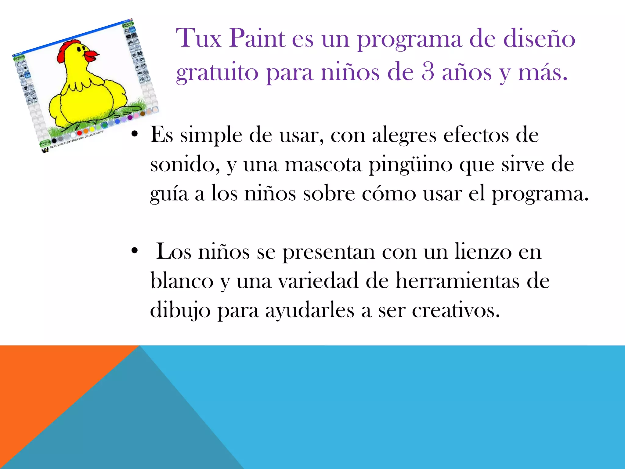 Tux Paint es un programa gratuito y fácil de usar para que los niños de 3 años en adelante dibujen de forma creativa, con herramientas como pinceles, sellos, líneas y formas, además de efectos de sonido divertidos y consejos del pingüino Tux.