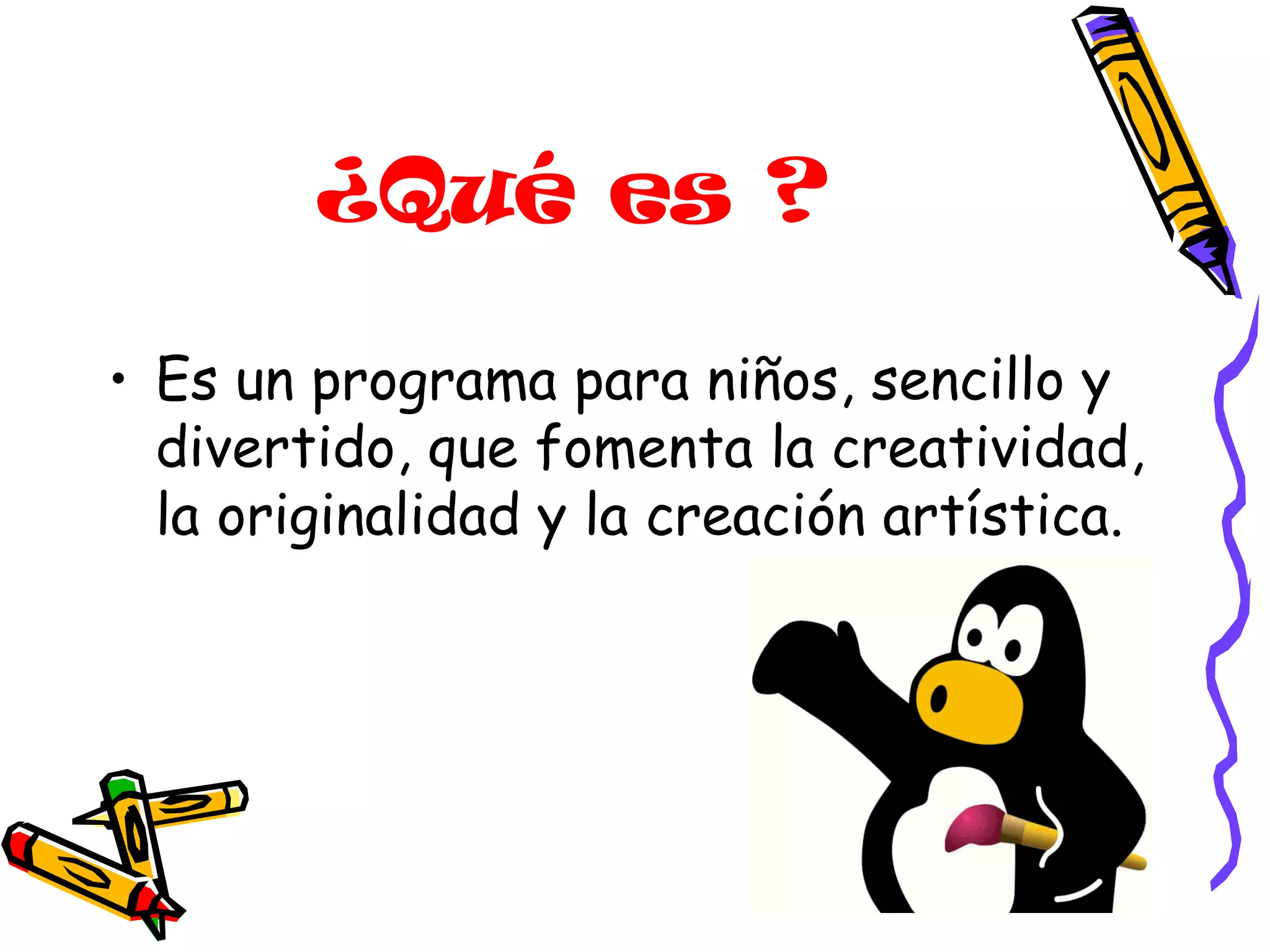 Tux Paint es un programa para niños que fomenta la creatividad y la creación artística a través de herramientas de dibujo fáciles de usar como pinceles, formas, colores y efectos. El programa tiene una interfaz intuitiva con grandes botones para que los niños puedan familiarizarse y crear trabajos usando sellos, colorear dibujos, y agregar sonidos motivantes.