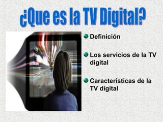 El documento describe la televisión digital DVB (Digital Video Broadcasting). Explica que la DVB transmite señales de televisión digital por satélite, cable o terrestre. Detalla algunas características como mejor resolución, mayor cantidad de canales, varios idiomas y subtítulos. También menciona ventajas como compresión de señal y desventajas como falta de compatibilidad con televisores analógicos y costos de equipamiento.