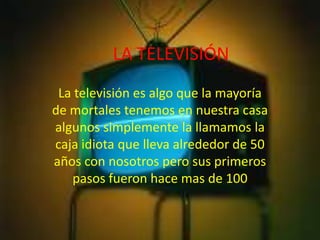 La televisión ha estado presente en Colombia por más de 50 años. Los primeros ensayos de televisión se realizaron en 1954 y la televisión se inauguró oficialmente en junio de ese año. A lo largo de la historia, se han introducido nuevos canales, se ha pasado de la señal en blanco y negro a color, y han aparecido canales regionales y privados. La televisión ha marcado la vida de varias generaciones colombianas.