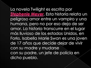 La novela Twilight narra la historia de amor entre la humana Isabella Swan y el vampiro Edward Cullen en el pueblo lluvioso de Forks, Washington. Al mudarse con su padre, Bella conoce a los Cullen, una familia de vampiros fuera de lo común. Aunque Edward ignora a Bella al principio, con el tiempo se hacen amigos y Bella descubre su secreto. A pesar de los peligros, deciden vivir su amor.