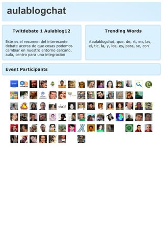 Debate generado en twitter con motivo del 7º Encuentro de Aulablog 2012 en Peñaranda de Bracamonte (Salamanca). Con la siguiente pregunta: ¿qué te gustaría cambiar o influir para que cambie en el uso TIC en el aula en tu entorno más cercano, en tu claustro?
