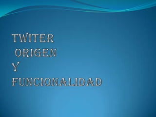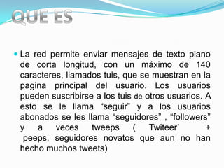Twitter es un servicio de microblogging que permite a los usuarios enviar y recibir mensajes de texto ("tuis") de hasta 140 caracteres. Los usuarios pueden seguir a otros para recibir sus tuis y pueden publicar tuis de forma pública o privada. Se lanzó en 2006 y permite a los usuarios enviar y recibir actualizaciones a través de la web, teléfonos móviles u otros medios.