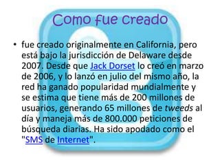 Twitter fue creado originalmente en California en 2006 por Jack Dorsey y se ha vuelto popular mundialmente con más de 200 millones de usuarios. Permite a las personas establecer estados breves de hasta 140 caracteres para compartir información e ideas sobre eventos en tiempo real. Ofrece herramientas para expresarse y comunicarse con otros, aunque no todas las herramientas de terceros son seguras.