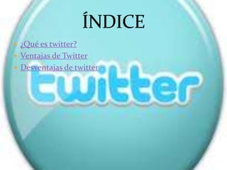 Este documento resume lo que es Twitter, sus ventajas y desventajas. Twitter es un servicio de microblogging lanzado en 2006 que permite enviar mensajes de hasta 140 caracteres llamados tweets. Entre las ventajas se encuentran que es dinámico, tiene múltiples aplicaciones y es personalizable. Algunas desventajas son que se volvió popular muy rápido lo que llevó a una pérdida de contenido, fomenta escribir menos y abreviar para caber en 140 caracteres, y es caldo de cultivo para spam en inglés.