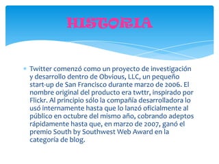 Twitter comenzó en 2006 como un proyecto interno de la startup Obvious LLC. Se lanzó públicamente en octubre de 2006 y ganó popularidad rápidamente. Twitter permite a los usuarios enviar "tweets" de hasta 140 caracteres vinculando la web y los teléfonos celulares. Los tweets permiten a los usuarios compartir qué están haciendo con sus contactos.