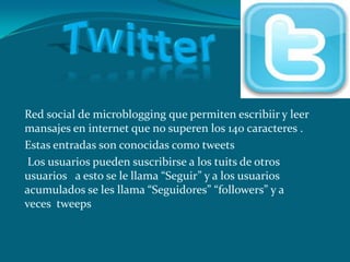 Twitter es una red social de microblogging que permite a los usuarios publicar mensajes ("tuits") de hasta 140 caracteres y seguir los tuits de otros. Los usuarios pueden publicar tuits desde la página web de Twitter o aplicaciones móviles y acumular seguidores.