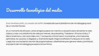 Twitter surgió de un esfuerzo fallido en crear una plataforma de radio por internet y evolucionó de un simple servicio de mensajería a una herramienta social influyente que permite la comunicación en tiempo real. A lo largo de su historia, ha jugado un papel importante en movimientos sociales y revoluciones, aunque también enfrenta críticas por la difusión de información falsa y el control de reputación online. Su diseño minimalista y funciones han atraído a millones de usuarios, convirtiéndolo en un líder en el microblogging.