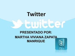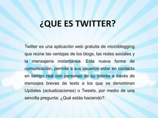 Twitter es una aplicación web gratuita de microblogging que permite a los usuarios enviar y recibir mensajes breves de hasta 140 caracteres, llamados tweets, para comunicarse en tiempo real con otras personas de interés. Los usuarios pueden seguir a otros para ver sus actualizaciones y pueden ser seguidos, y la aplicación ofrece hashtags y temas tendencia para encontrar personas con intereses similares. El objetivo principal de usar Twitter es compartir información de manera profesional, ampliar la red de contactos, y mantenerse informado sobre lo que ocurre en línea.