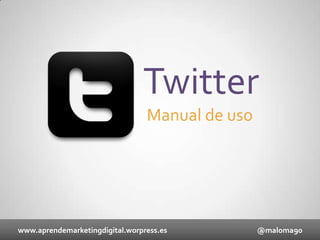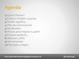 Este documento presenta una guía sobre el uso de Twitter. Explica que Twitter es una red social de microblogging que permite publicar mensajes cortos llamados tweets. Incluye secciones sobre cifras de usuarios, vocabulario común, consejos para mejorar el perfil, métricas para medir el rendimiento y ejemplos exitosos como Coca-Cola, Movistar y Red Bull.