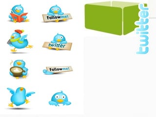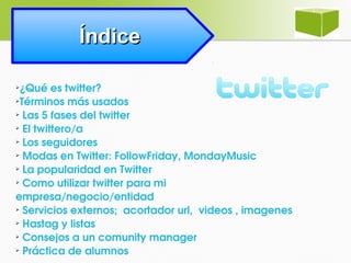 Este documento ofrece una introducción a Twitter, incluyendo una definición de Twitter, los términos más usados como "tuit", "timeline" y "hashtags", las 5 fases típicas de un usuario de Twitter, cómo usar Twitter para una empresa, y consejos para gestores de comunidades y marketing en Twitter. Explica conceptos como seguidores, seguidos, modas como #FollowFriday, y cómo medir la popularidad en Twitter.