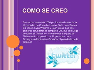 Twitter fue creado en 2006 por Jack Dorsey, Biz Stone, Evan Williams y Noah Glass en la Universidad de Cornell. Es una aplicación web gratuita de microblogging que permite a los usuarios enviar y recibir "tweets", mensajes de texto de hasta 140 caracteres, para comunicarse con otras personas. Los usuarios pueden acceder a Twitter a través de la web, teléfonos móviles u otras aplicaciones de terceros.