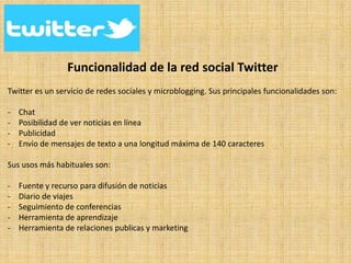 Jack Dorsey creó Twitter en California en 2006 y lo lanzó públicamente en julio de ese año, ganando rápidamente popularidad mundial con más de 200 millones de usuarios que comparten 65 millones de tuits diarios. Twitter es un servicio de microblogging que permite enviar mensajes de hasta 140 caracteres, y se usa comúnmente para difundir noticias, compartir experiencias de viaje, seguir conferencias y como herramienta de marketing.
