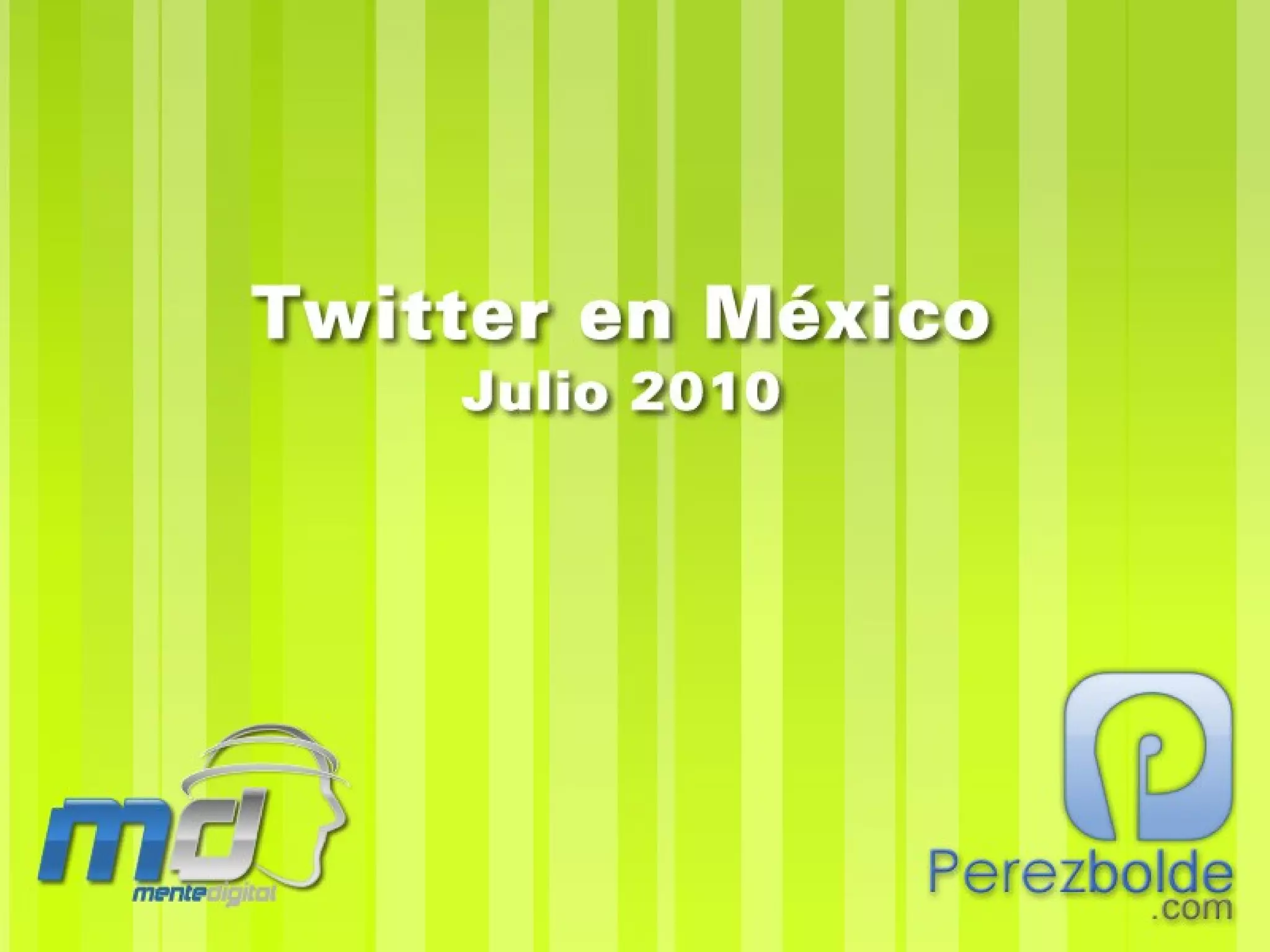 Este documento resume estadísticas sobre usuarios de Twitter en México en 2010. Había alrededor de 960,673 usuarios activos, con una distribución de 56% hombres y 44% mujeres. La mayoría (86%) publicaba 0-1 tweets por día. Los sistemas operativos más populares eran Windows y Mac. Argentina era el país con el que los usuarios mexicanos interactuaban más. El día de la semana con más actividad era martes y el momento de pico era entre 3-7 pm.