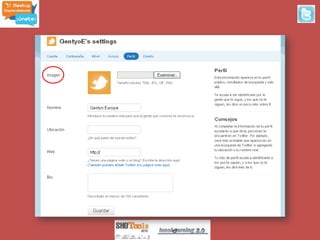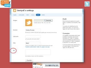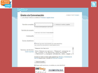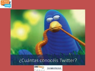 Este documento proporciona información sobre Twitter, incluyendo su origen, definiciones, cómo usarlo y aplicaciones relacionadas. Brevemente describe que Twitter es un servicio de microblogging lanzado en 2006 que permite enviar mensajes cortos de texto llamados "tweets", y que se ha convertido en una plataforma popular para compartir noticias e información.