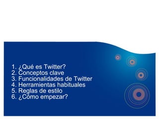 Twitter es una plataforma de microblogging que permite publicar mensajes ("tweets") de hasta 140 caracteres. El documento explica conceptos clave como el timeline, seguidos, seguidores y hashtags, e incluye funcionalidades como retweets, mensajes directos y listas. Además, detalla herramientas populares para usar Twitter y reglas de estilo, concluyendo con pasos para crear una cuenta y empezar a usarla.