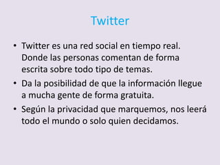 Este documento proporciona instrucciones para crear una cuenta de Twitter y personalizar el perfil de usuario. Explica que Twitter es una red social donde las personas comparten comentarios breves sobre varios temas y que la privacidad determina quién puede ver los tweets. A continuación, detalla los pasos para introducir un nombre de usuario, confirmar la cuenta a través del correo electrónico y editar la foto y otros detalles del perfil.
