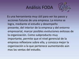 Este documento presenta un análisis FODA del curso "Computación para Empresas Turísticas". El análisis identifica las fortalezas como integrar tecnologías digitales en hoteles pequeños y usar recursos computacionales para fortalecer su competitividad. Las oportunidades incluyen desarrollar habilidades digitales básicas y usar herramientas como Word y Excel. Las debilidades son la falta de acceso a Internet y conocimientos básicos de computación. Las amenazas son el abandono del curso debido a falta de recurs