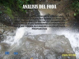 Este documento presenta un análisis FODA (Fortalezas, Oportunidades, Debilidades, Amenazas) de una universidad estatal a distancia y su programa de computación para empresas turísticas. Entre las fortalezas se encuentran el acceso a muchos estudiantes, la información precisa y concisa, y la interacción con tutores. Las debilidades incluyen la falta de acceso a Internet para todos y conocimientos tecnológicos. Las amenazas son el poco tiempo entre tareas y la falta de comprensión y desinterés de los