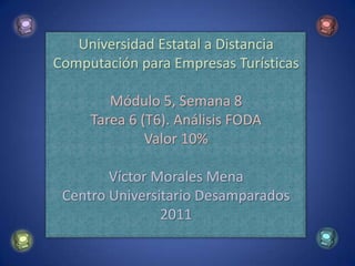 El documento presenta un análisis FODA de un curso de computación para empresas turísticas. Entre las fortalezas se encuentra que el curso proporciona conocimientos y herramientas informáticas útiles para empresas turísticas sostenibles como Windows, Word, Excel, Publisher e Internet. Las oportunidades incluyen aprender sobre estructuras internas y externas del computador y aplicar funciones básicas de varias aplicaciones. Las debilidades son la falta de presencia de un profesor y la posible no consecución de los objetivos. Las