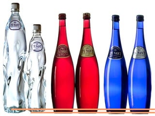 El documento describe el origen y la historia de la marca de agua mineral Solán de Cabras. Se originó en Gales en 1989 y rápidamente ganó popularidad en hoteles y restaurantes de lujo por su botella de cristal azul diseñada por Ross Lovegrove. Actualmente, Solán de Cabras se puede encontrar en los mejores establecimientos de todo el mundo y es conocida por su característica botella de cristal azul diseñada en 1898.