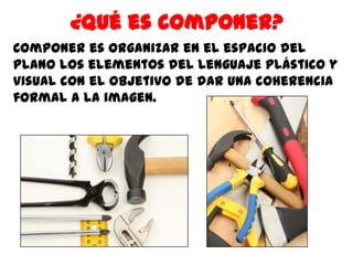 El documento habla sobre los factores que intervienen en la composición de una imagen, incluyendo la percepción, el formato, las figuras y los planos, el peso y el equilibrio, los esquemas compositivos, el ritmo, la proporción y la simetría. Explica conceptos como líneas horizontales, verticales y oblicuas, y leyes compositivas como la balanza, la compensación de masas y los tercios.