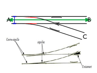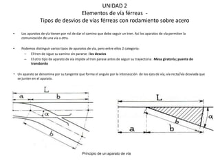 Este documento describe los diferentes tipos de desvíos de vías férreas, incluyendo sus componentes y principios de funcionamiento. Explica que los desvíos permiten la comunicación entre vías y distinguen entre desvíos donde el tren continúa sin parar y otros donde debe detenerse. También cubre el historial de los aparatos de vía y los diferentes tipos de desvíos como simétricos, asimétricos y de comunicación simple.
