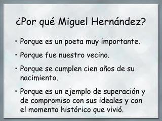 Este documento presenta información sobre el poeta español Miguel Hernández para una actividad educativa. Explica que se cumplen 100 años de su nacimiento y proporciona detalles sobre su vida, obra y el contexto histórico en el que vivió. También incluye preguntas para los estudiantes, enlaces a recursos sobre Hernández y sugerencias para actividades como leer su poesía y visitar lugares relacionados con él.