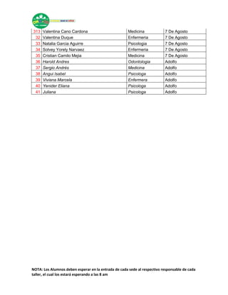 Este documento lista los participantes de varios talleres que se llevarán a cabo en la Facultad de ciencias para la salud, la Facultad de artes y humanidades, la Facultad de ciencias jurídicas, la Facultad de ingenierías y la Facultad de Ciencias Exactas. Los talleres comenzarán a las 8 am y los participantes deben llevar guantes, tapabocas y delantal según el taller.