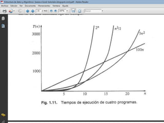 El documento habla sobre el análisis de algoritmos y la complejidad de tiempo. Explica conceptos como la notación O para describir el orden de complejidad asintótico de un algoritmo, así como reglas para calcular la complejidad de estructuras como secuencias, decisiones if/else, bucles anidados y llamadas a procedimientos. También incluye ejemplos de código y sus respectivos órdenes de complejidad como O(n3).