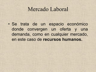 El documento describe el mercado laboral y la empleabilidad. Explica que el mercado laboral es donde convergen la oferta y demanda de recursos humanos. La empleabilidad se refiere al nivel de competitividad de un trabajador. También analiza cómo la economía actual introduce más flexibilidad y tecnología, así como una menor estabilidad laboral, por lo que es importante desarrollar competencias colectivas y gestionar la complejidad.