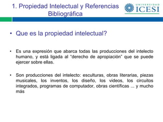 Este documento trata sobre la propiedad intelectual. Explica que la propiedad intelectual incluye todas las creaciones del intelecto humano como obras literarias, musicales, inventos y diseños. También describe los sistemas de propiedad intelectual que otorgan derechos legales sobre estas creaciones, incluyendo los derechos morales y patrimoniales. Finalmente, resume la normatividad colombiana sobre la propiedad intelectual.